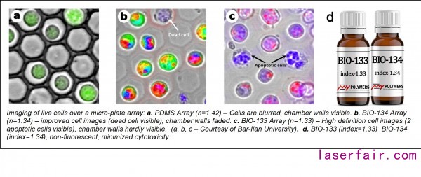 BIO-133 from MY Polymers Ltd. enables breakthrough in fluorescence microscopy. The refractive index of this UV cured polymer is 1.33 – the same as water, cells and tissues. Therefore, it eliminates imaging distortion. In addition, the material was designed to minimize cytotoxicity and fluorescence.