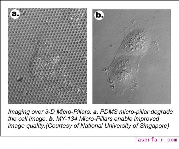 In addition to micro-fluidic devices and micro-well arrays, BIO-133 is used also to improve image resolution in various imaging applications where the surface is patterned in any manner. One interesting example is the fabrication of micro-pillars, which are used to study cellular processes. The image below show the improved quality when building the micro-pillars from BIO-133 (right picture) as compared to PDMS (left picture).