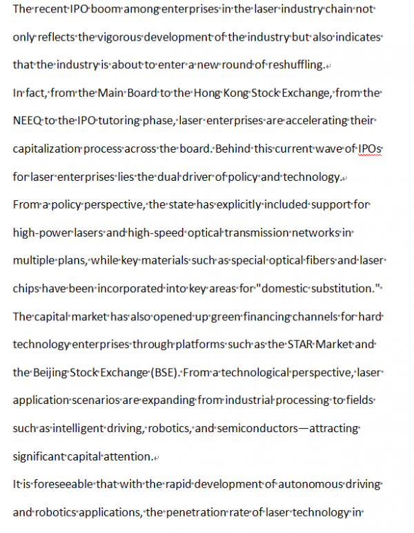 According to incomplete statistics, as of now, more than 10 enterprises in the laser industry chain are intensively advancing their IPO processes, covering segmented fields such as special optical fibers, semiconductor equipment, and laser radars. The planned total fundraising amount is expected to exceed 10 billion yuan.