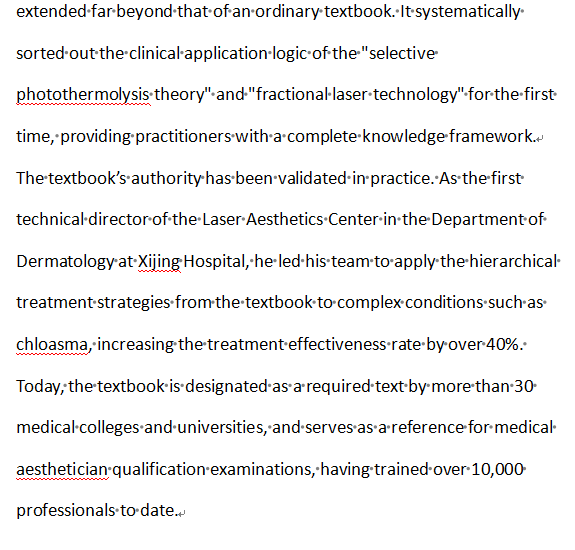 In terms of industry norms, Sun has led the formulation of multiple technical standards. In 2024, he participated in drafting the Chinese Expert Consensus on the Application of Micro-Focused Ultrasound in Skin Anti-Aging Aesthetics, which for the first time clarified the indications and contraindications of ultrasound therapy and established quantified indicators for operational procedures. This consensus was incorporated into the technology promotion program of the Chinese Association of Plastics and Aesthetics, providing a scientific basis for the safe development of the industry.