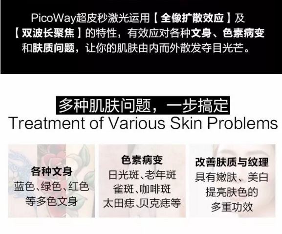 一站式解決各類肌膚問題,為廣大求美者提供安全、高效、舒適的治療感受。對于色素他有一套獨有的波長在做到徹底祛除色素。