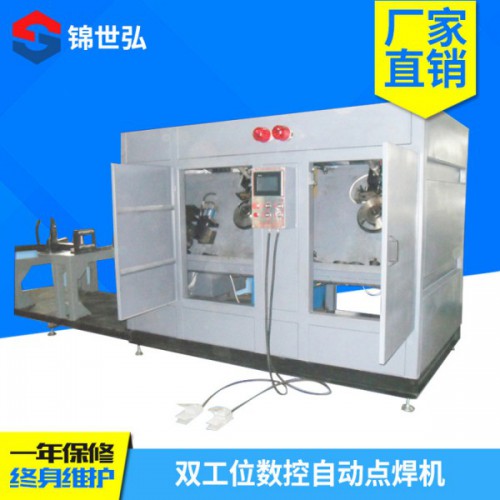 工人將工件放入模具內→雙手按下氣動按鈕→模具油缸夾緊→出料油缸工作將產品移動焊接位置→送料伺服將料送出指定長度→卷圓壓輪下移將鋼帶壓住→焊控打開開始焊接同時將鋼帶切斷→焊接時間到(有弧光檢測)→模具伺服電機轉到設定角度停止→焊控打開開始焊接第二個焊點→焊接時間到(有弧光檢測)→模具伺服電機轉到下一個設定角度停止焊接,→次將所有設定的所有焊點焊完→模具伺服電機將轉到初始位置停止→卷圓壓輪動作至上死點→焊控打開→時間到后步進電機運動焊槍原焊縫移動至所設長度→關閉焊控停止焊接→將焊好的產品送出至工人裝卸位置后進入下一循環