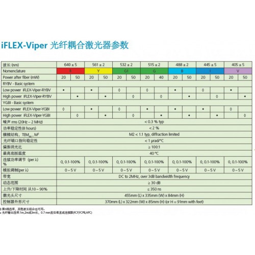 該激光器具有良好的性能,比相干coherent激光器具有更好的信噪比和穩定性。在高質量的生物成像中,市場越來越流行使用多波長激光。iFLEX-Viper系列最多提供5波長組合,應用于激光掃描共聚焦顯微、流式細胞儀、DNA篩選、生物計量檢測等。閉環調制特性(CLM)特性為iFLEX-激光系統提供調制能力,無需重新校準,并在激光生命周期內提供超低噪音和異常功率穩定性。