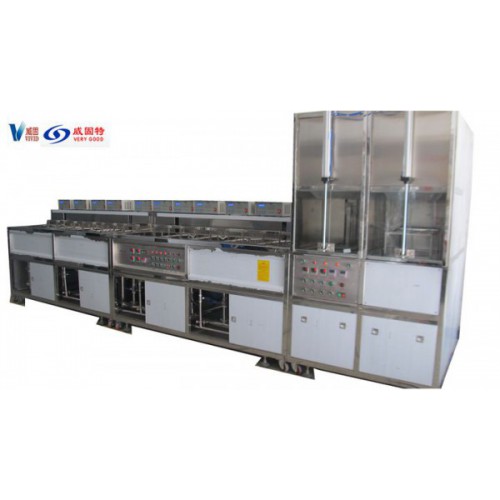 VGT-1207FT為光學超聲波清洗機,設備共有12個功能槽,配置有循環過濾系統、有機溶劑蒸餾回收系統、自動恒溫系統、拋動系統、超聲波清洗系統、抽風裝置等組成。設備采用環保型有機溶劑洗滌、水溶劑洗滌、純水漂洗,為環保型清洗機。
