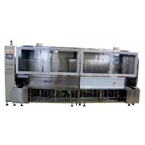 此設(shè)備共有8個(gè)功能槽,配置有循環(huán)過(guò)濾系統(tǒng)、自動(dòng)恒溫系統(tǒng)、觸摸屏系統(tǒng)、拋動(dòng)系統(tǒng)、超聲波清洗系統(tǒng)、預(yù)熱箱系統(tǒng)、溢流系統(tǒng)等。設(shè)備采用水溶劑洗滌、純水漂洗,為環(huán)保型清洗機(jī)。