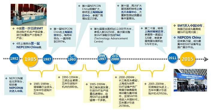 1985年春,勵展博覽集團在上海舉行了第一屆NEPCON展覽會。在經歷了25屆的發展歷程,逐漸成為了全球最具規模化且不容錯過的SMT行業相關企業的主要貿易交流平臺。