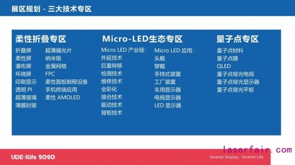博覽會(huì)特別設(shè)立柔性折疊、Micro-LED、量子點(diǎn)三大技術(shù)專區(qū),可以說顯示產(chǎn)業(yè)最火爆的三大亮點(diǎn)技術(shù)將在UDE&iLife2020吹響集結(jié)號(hào)。