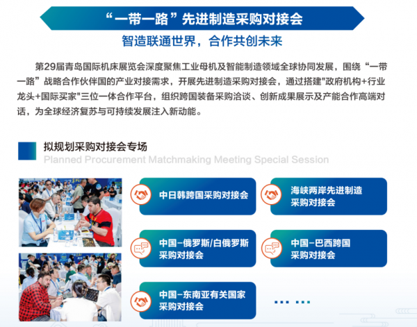 第29屆青島國際機床展覽會深度聚焦工業母機及智能制造領域全球協同發展,圍繞“一帶一路”戰略合作伙伴國的產業對接需求,開展先進制造采購對接會,通過搭建"政府機構+行業龍頭+國際買家"三位一體合作平臺,組織跨國裝備采購洽談、創新成果展示及產能合作高端對話,為全球經濟復蘇與可持續發展注入新動能。