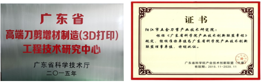 研究院在項目開發(fā)的同時,也積極開展五金刀剪產(chǎn)業(yè)公共技術(shù)服務(wù)平臺的建設(shè)。研究院通過了廣東省第二批新型研發(fā)機構(gòu)的認(rèn)定;組建的《廣東省高端刀剪增材制造(3D打印)工程技術(shù)研究中心》通過了廣東省科技廳的認(rèn)定;作為牽頭單位,組建的《廣東省五金刀剪智能制造產(chǎn)業(yè)技術(shù)創(chuàng)新聯(lián)盟》通過了廣東省科技廳的認(rèn)定。此外研究院還成功加入廣東省科學(xué)院產(chǎn)業(yè)技術(shù)創(chuàng)新聯(lián)盟、廣東省激光產(chǎn)業(yè)技術(shù)創(chuàng)新聯(lián)盟、廣東省激光行業(yè)協(xié)會等,拓寬了研究院的發(fā)展道路以及與業(yè)內(nèi)同行的合作機會,也為陽江刀剪產(chǎn)業(yè)的轉(zhuǎn)型升級發(fā)展提供了更好服務(wù)平臺。部分平臺證書如圖9所示。