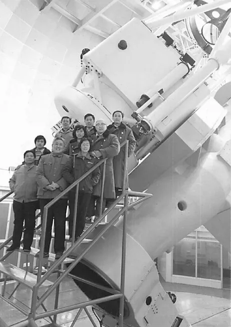 1989年2.16米望遠(yuǎn)鏡運(yùn)送到北京天文臺興隆站后潘君驊(中排右一)與研究人員在圓頂室內(nèi)合影(圖片來源于清華大學(xué)校史館)