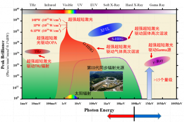 要產生兆電子伏特的光子也就是伽馬射線光子,需要電子束跟激光束相互的作用?;谙嗤脑?,更低的電子能量(毫電子伏特)也是很熱鬧的一個研究領域,叫太赫茲。也同樣,它的最佳手段也是把兩者來進行相互作用。所以,高能量和低能量區域都離不開這兩個手段的結合。