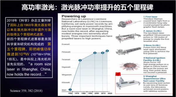 1960年第一臺激光器發明之后,它的功率是瓦級,甚至沒有達到我們日常照明燈光的功率。而現在我們達到了十個拍瓦(萬萬億瓦)。當然,歐洲、美國、英國的國際同行也在建設一些類似的裝置,大家都在朝著更高的峰值功率這個目標邁進。
