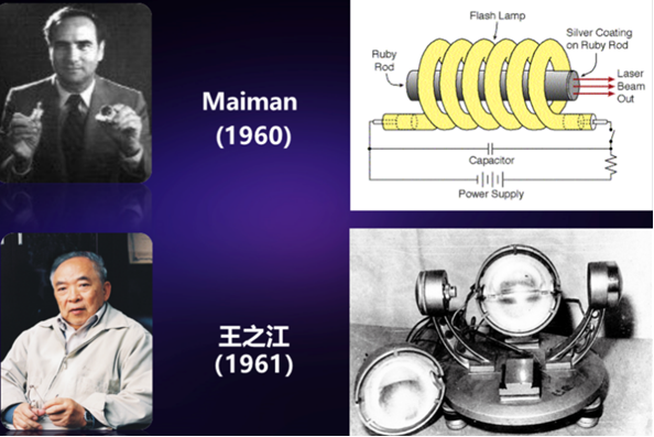 中國的第一臺激光器是王之江老師1961年在長春做的。它與美國的第一臺激光裝置有差別。雖然他們利用的方法有所不同,但基本原理類似。中國的這一臺裝置在原理設計上面能夠提供更高的效率。