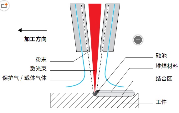 將金屬粉末逐層堆焊在基體材料上(燒熔中 無氣孔且無裂紋)。因此,金屬粉末與表面間 的連接強度極高。堆焊過程中,同軸的惰性 氣體提供保護,避免氧化。金屬層冷卻后可 進行機械加工。