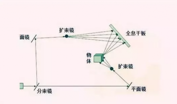 全息技術第一步是利用干涉原理記錄物體光波信息,此即拍攝過程:被攝物體在激光輻照下形成漫射式的物光束;另一部分激光作為參考光束射到全息底片上,和物光束疊加產生干涉,把物體光波上各點的位相和振幅轉換成在空間上變化的強度,從而利用干涉條紋間的反差和間隔將物體光波的全部信息記錄下來。記錄著干涉條紋的底片經過顯影、定影等處理程序后,便成為一張全息圖,或稱全息照片。