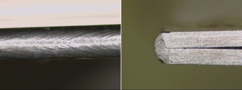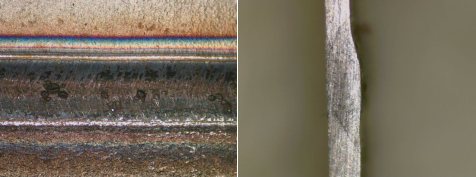 圖2(a)為焊縫正面,放大倍數45倍??梢钥闯觯雽w激光焊接杯口表面光滑、平整,滿足工藝要求,無需磨口處理。而氬弧焊對人員焊接技能要求較高,且焊接發黑、不平整,需要磨口處理。