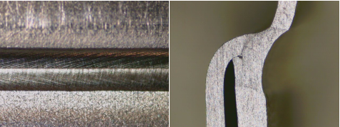 圖3(b)為焊縫橫截面,此焊縫為不等板厚拼接焊,焊縫正面飽滿無任何塌陷、咬邊現象,焊縫背面平整無燒蝕塌陷;焊縫深度不小于0.3mm,且焊縫內無任何氣孔等缺陷,完全滿足保溫杯使用強度及氣密性要求。