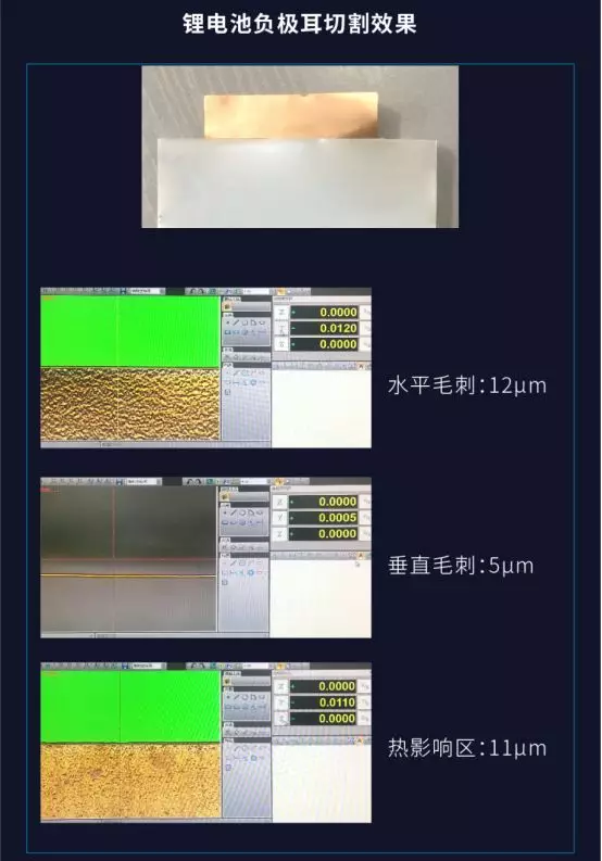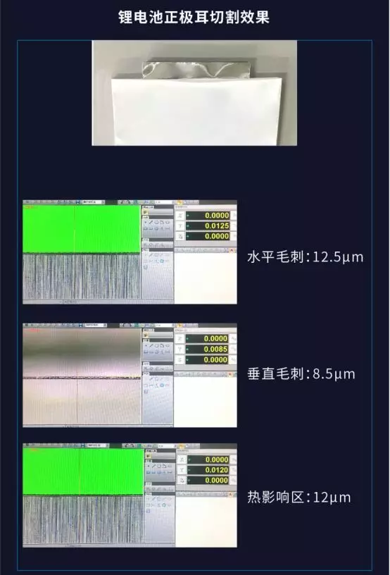 從切割效果可見:激光切割極耳的垂直毛刺小于10um,水平毛刺小于15um,熱影響區小于15um。這些工藝瑕疵得到嚴格的控制,極大降低了鋰電池的安全隱患。