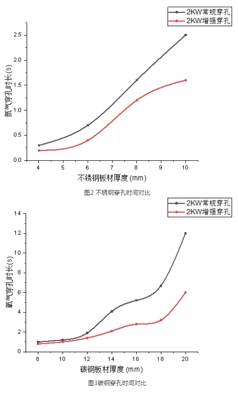 通過對2000W常規脈沖穿孔和增強脈沖穿孔進行了碳鋼和不銹鋼穿孔測試,具體數據如下: