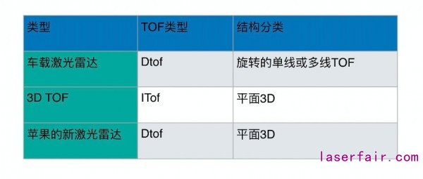 下面本文分析蘋果新的激光雷達和之前的手機3D TOF還有車載雷達有什么區別,有什么技術突破.首先三者的結構實現和算法原理的區別可以參考下表:
