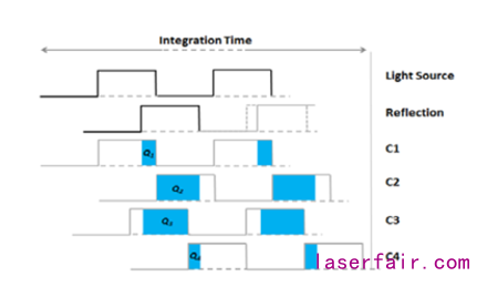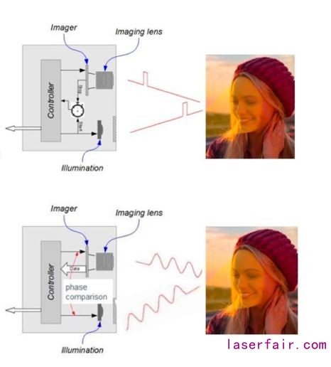 Itof和Dof在sensor和算法上的也有不小的區別. Itof目前更多是使用global shutter sensor 或者是在這個基礎上改進的專用sensor.以原始的global shutter sensor 為例,最終的算法是使用基于正弦波的相位計算, 一般需要使用四幀圖像才能通過相位得到距離,而這導致了sensor不得不工作在4倍于3D成像的幀率,比如3D成像需要30fps,sensor就不得不工作在120fps.這導致了系統功耗的增加和幀率提升的困難.