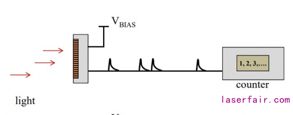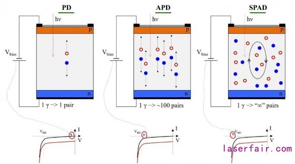 下圖左起第一個是一般成像使用的PD(光電二極管),第二是APD(雪崩二極管),第三個是SPAD(單光子雪崩二極管),其主要差別APD和SPAD在通過增加偏置電壓,在光子到光電二極管的時候會產生雪崩效應,就是產生大量的電子.這對成像不利,但是對于檢測脈沖則很好.而SPAD比PAD更敏感,也就是只需要很少的光子就能產生雪崩效應.