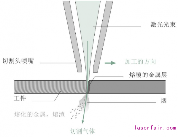 圖1 激光束熔化工件,切割氣吹走切口中的熔融材料和熔渣