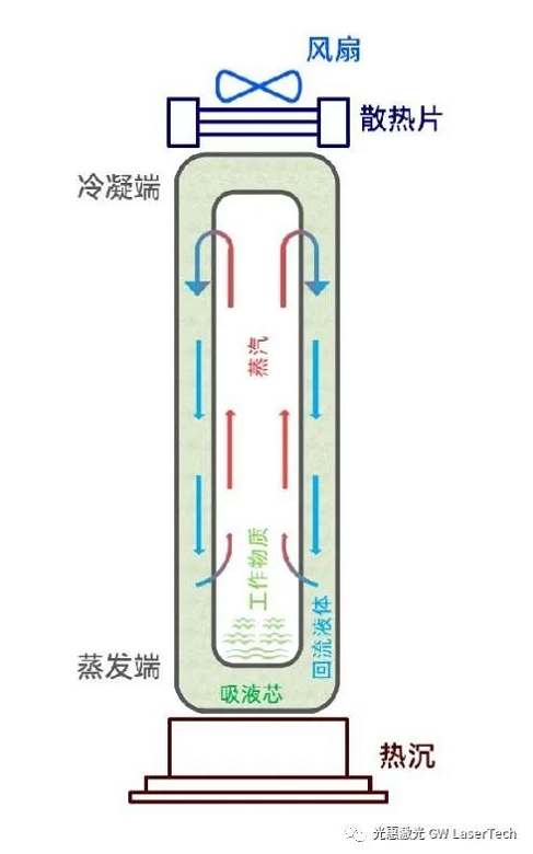 熱管散熱器散熱是指熱管依靠自身內部的工作液體相變來實現傳熱,這種液體沸點低,容易揮發。熱管一端為蒸發端,連接激光器內部的熱沉;另外一端為冷凝端,連接外部的散熱片與風扇。管壁有吸液芯,由毛細多孔材料構成。當激光器發熱時,蒸發端受熱,工作液體迅速蒸發,蒸汽在壓力差下流向冷凝端,并且釋放出熱量,通過風扇排出;同時,蒸汽重新凝結成液體,液體通過吸液芯再流回蒸發段(若是重力熱管,則沒有吸液芯,液體附著在管壁上依靠重力流回底部蒸發段)。如此循環不止,便實現了熱量從激光器內部轉移到外部。