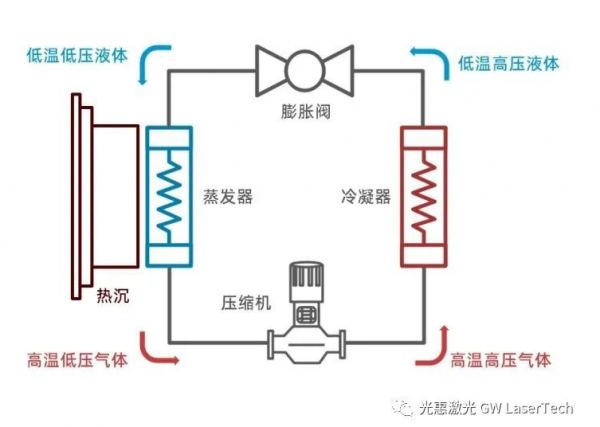 壓縮機制冷散熱原理:壓縮機壓縮冷媒,使冷媒變成高溫高壓的氣體,并流向外部冷凝器。高溫高壓氣體冷凝成低溫高壓的液體,液化產生的熱量隨風扇排出機器外。低溫高壓的液體冷媒通過膨脹閥降壓后變成低溫低壓易蒸發的狀態,并流向內部蒸發器。蒸發器吸收熱量,使激光器內部溫度降低,達到降溫的效果,然后冷媒汽化成高溫低壓的氣體。經蒸發器蒸發后的氣體冷媒再次被壓縮機壓縮,往復循環,便實現了機器內部的散熱。