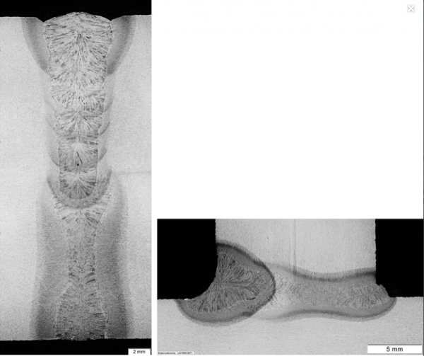 使用激光 MPNG 生產(chǎn)的焊接接頭和 T 型接頭的橫截面顯示:可以在顯著降低成本和資源消耗的情況下保證的超高焊縫。