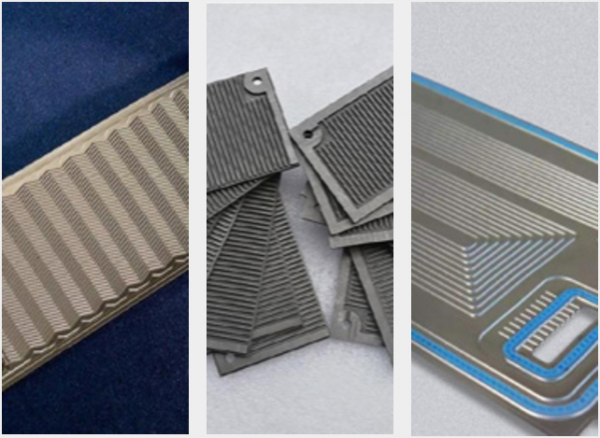 雙極板(簡稱BPP)主要作用為支撐MEA、提供氫氣、氧氣和冷卻液流體通道并分隔氫氣和氧氣、收集電子、傳導熱量。常見的雙極板材料有石墨、復合材料和金屬。金屬材料具有機械強度高、體相電導和熱導優良,容易制成薄板并沖壓加工成型的特點,其應用最為廣泛。
