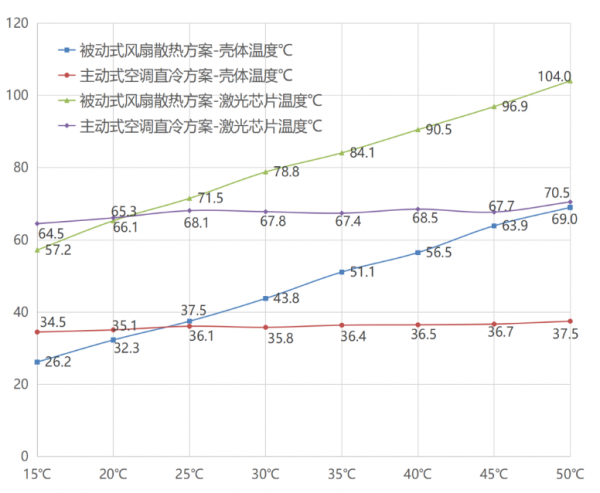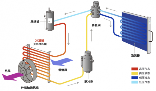 02\強制風冷 VS 空調直冷 首先我們先來了解一下強制風冷的散熱方式在手持激光焊機中的優缺點; 優勢:強制風冷技術是通過將熱量傳導的形式,將所產生的熱量傳導至鋁制散熱器,通過風扇吹動環境空氣快速流動,從而實現對散熱器的自然換熱。相比于水冷散熱技術,風冷散熱不需要額外配備水冷箱,可以減少設備數量和體積。 劣勢:由于采用自然對流的換熱方式,其散熱效率受環境溫度影響較為明顯,在高溫環境下無法保障散熱效率,導致半導體激光芯片升高,降低激光芯片使用壽命,無法滿足高溫環境下的持續可靠運行。 (傳統被動式風冷散熱方案) 為什么說強制風冷的散熱方式無法保障激光芯片在高溫下會降低使用壽命,甚至失效風險? 半導體激光芯片作為核心元件被封裝在一個密封的金屬殼體中,形成一個完整的半導體激光泵浦,在工作中會釋放大量的熱,如果是一臺1500W的激光器滿功率運行,按照泵浦電光效率55%計算,其半導體泵浦散熱功率大約在2100W左右,當環境溫度30攝氏度時,半導體泵浦殼體溫度在44攝氏度左右,此時激光芯片溫度即可達到75攝氏度以上,如果環境溫度達到35攝氏度以上,激光芯片工作溫度將高于80攝氏度以上,面臨著極高的失效風險,所以對于傳統強制風冷的散熱方式來說,整機2500W左右的熱量需要通過鋁制散熱器進行自然對流進行熱交換,其難度可謂巨大,加上激光芯片在高溫運行下的失效風險,無法滿足設備長期可靠的連續運行。 (與傳統風冷散熱方案在不同溫度下激光芯片溫度的變化) 我們再來了解一下主動式空調直冷散熱技術在手持激光焊機中的優缺點 優勢:其原理是將空調壓縮機與光纖激光器結合,通過空調壓縮機將氣態的制冷劑壓縮為高溫高壓的氣態,并送至冷凝器進行冷卻,經冷卻后變成中溫高壓的液態制冷劑,中溫液態的制冷劑經膨脹閥節流降壓,變成低溫低壓的氣液混合體,經過激光器內部吸收熱量而汽化,變成氣態,然后再回到壓縮機繼續壓縮,繼續循環進行制冷,在制熱的時候四通閥使氟利昂在冷凝器與蒸發器的流動方向與制冷時相反,從而達到制熱的效果。 劣勢:由于采用了近似于變頻空調的技術原理,其制造成本高于普通散熱器的強制風冷散熱方式,其次設備重量略高。