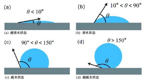 由楊氏方程可知,靜態接觸角的大小與固體表面化學自由能有關,可以通過降低表面化學自由能來提高靜態接觸角。潤濕性狀態也是由靜態接觸角的大小來定義。通常情況下,當接觸角在0°<θ<10°時,水滴基本平鋪在固體表面,稱為超親水狀態;接觸角在10°<θ<90°時,稱為親水狀態;接觸角在90°<θ<150°時,水滴在表面呈現半球形狀,此時稱為疏水狀態;而當接觸角在150°<θ<180°,滾動角<10°時,水滴滴落在表面呈現近球形狀,此時稱為超疏水狀態。 圖1.2 不同濕性狀態的接觸角