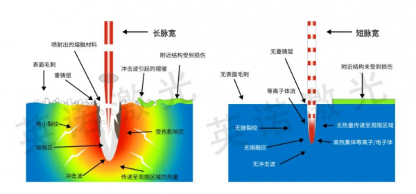 1.2 皮秒激光器的加工技術 針對鎂合金耐蝕性差的問題,我們采用自主研發的皮秒激光器對鎂合金進行加工,對表面處理實施性價比更高的激光加工方案以適用于工業化生產應用。激光加工技術具有可便利地加工出表面微織構、可調控表面潤濕性和對環境要求低等優勢,而超短脈沖激光在加工過程中更是具有較小的熱影響,如圖1.3所示,對表面形貌的構建有更好的展現性。該項目采用的方法相較于其他表面處理提高耐蝕性,具有高精度、高效率、低成本的優勢,以致力于激光在行業中的應用。 圖1.3 激光加工原理