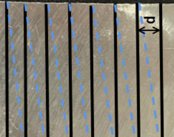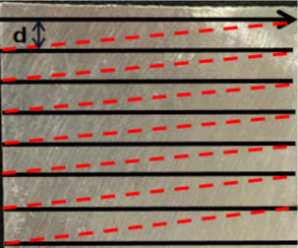 3.2 實驗結果 單X軸或單Y軸的掃描路線可以形成周期性的凹槽,但相關研究表明在同等參數加工下,單軸加工后的表面接觸角小于雙軸加工,因此采用交叉型掃描路線,如圖1.7所示,先進行X軸加工,再進行Y軸加工,掃描間距為d。 圖1.7 AZ91D鎂合金激光掃描路徑
