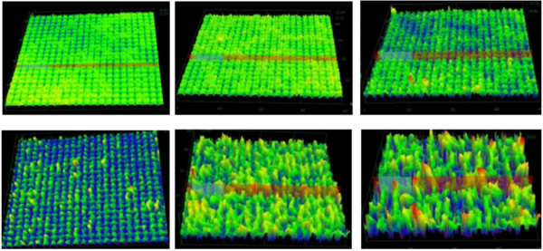 研究了激光能量密度對表面形貌的影響規律,優化了激光平均功率對微織構排列的工藝參數。圖1.8為不同能量密度對鎂合金表面形貌的影響,從三維形貌圖中可以觀察到,當能量密度為0.956J/cm2和1.611J/cm2時,激光已開始對鎂合金基體產生刻蝕效果,其中微織構并沒有形成很深的凹槽,這是由于激光能量密度過小,無法在鎂合金表面形成一定深度;當能量密度提升到2.433J/cm2和3.389J/cm2時,表面形成高度不一的微織構呈一定周期性排列,且局部受熱影響產生堆積現象,在激光加工過程中金屬液滴的飛濺有利于微納米顆粒物的產生;當能量密度達到4.445J/cm2和5.58J/cm2時,表面受到了較為嚴重的熱影響,幾乎全表面發生重熔現象,加工的微織構呈不規則狀排列。由此可知,當能量密度在2.433~3.389J/cm2時,最適合周期性微織構的構建。 圖1.8 不同能量密度對表面形貌的影響。從左至右 (a) 0.956J/cm2 (b) 1.611J/cm2 (c) 2.433J/cm2 (d) 3.389 J/cm2 (e) 4.445J/cm2 (f) 5.58J/cm2