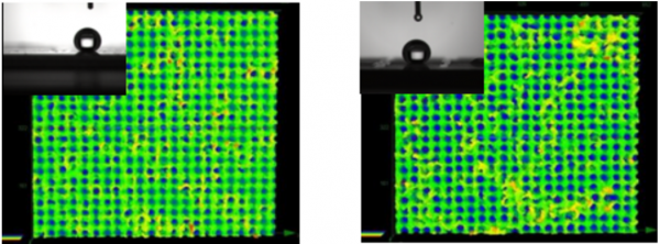 02、固體表面潤濕性的基本原理 固體材料的潤濕性是由表面自由能和粗糙度所決定的[4,5],因此,采用激光技術構建呈周期性排列的凹坑和柱狀凸起的微織構,伴隨微織構周圍由激光加工過程中產生的微納米顆粒,提高表面粗糙度,當液滴滴落在固體表面時,微納米顆粒將“托”著水滴在液體與固體之間形成一層“空氣膜”,使水滴無法完全潤濕表面,更有利于超疏水Cassie狀態的形成。