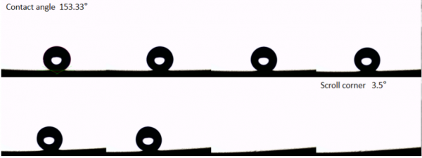 上述實驗內容通過控制變量法確定了激光能量密度的選用范圍,而影響表面潤濕性的工藝參數還包括激光掃描速度、掃描間距和重復次數,采用相同方法依次縮小最優工藝參數的選擇范圍。 經過不斷的參數優化,當能量密度為3.389J/cm2,速度為800mm/s,掃描間距為30μm,重復次數為6次和能量密度為4.44J/cm2,速度為1000mm/s,掃描間距為30μm,重復次數為7次時,在低溫熱處理后表面達到了超疏水的效果,其三維形貌如圖1.9所示,可以觀察到微織構呈周期性排列且凹坑存在一定深度,對其潤濕性進行測量,靜態接觸角分別達到了150.67°和151.19°;采用高速攝像頭對其滾動角拍攝,如圖1.10所示,測量滾動角為3.5°,完全符合超疏水表面的要求。 圖1.9 超疏水表面三維形貌圖及接觸角測量