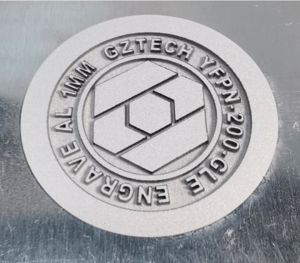 2、鋁深雕 鋁材相對較軟,容易被去除,采用較大單脈沖能量去除率更高。使用頻率135kHz,功率90%,速度2000mm/s,填充間距0.04mm,雕刻1mm深成品表面毛刺少,底紋細膩,深度均勻,去除效率可達107mm3/min。