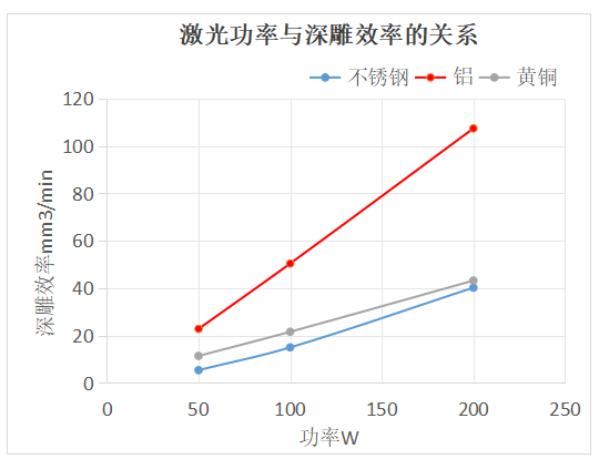 5、功率對深雕效率的影響 激光可以在鋼、鋁、銅等金屬進行深度雕刻,如果不考慮效率,不論多少深度都是可以實現的。但是實際生產中,由于生產節拍的要求,往往對效率的要求都會比較高。功率越高效率越快,設備成本也會越高。根據需要,選擇合適的功率進行深雕,讓設備具有最佳性價比。我們使用GLE不同功率激光器對不銹鋼、鋁、銅進行了深雕效率對比,獲得了以下激光功率與深雕效率的關系圖。