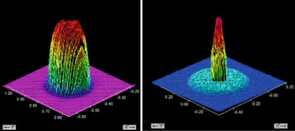 圖2. 光束截面的能量分布。右側是普通單光源光束?100 μm,左側是二合一激光的光束質量。