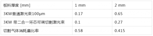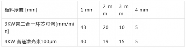 表3. 3KW帶二合一環(huán)芯可調和4kw普通光束切割的速度對比。測試設備是TruLaser Cell 8030 3KW