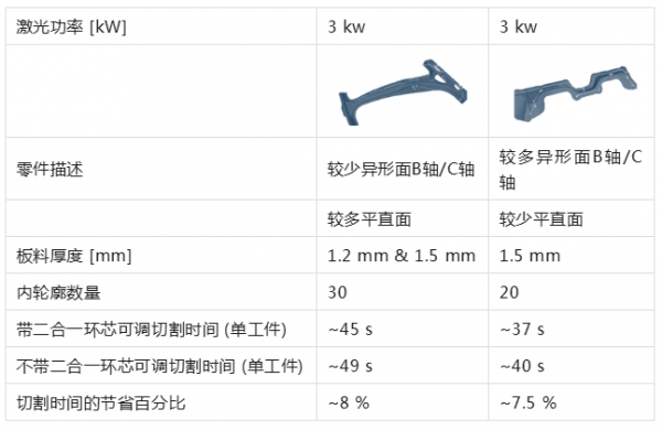 表1. 二合一環(huán)芯可調切割二維平板時間數據對比。測試設備是TruLaser Cell 8030
