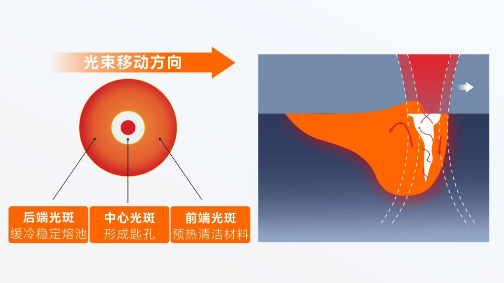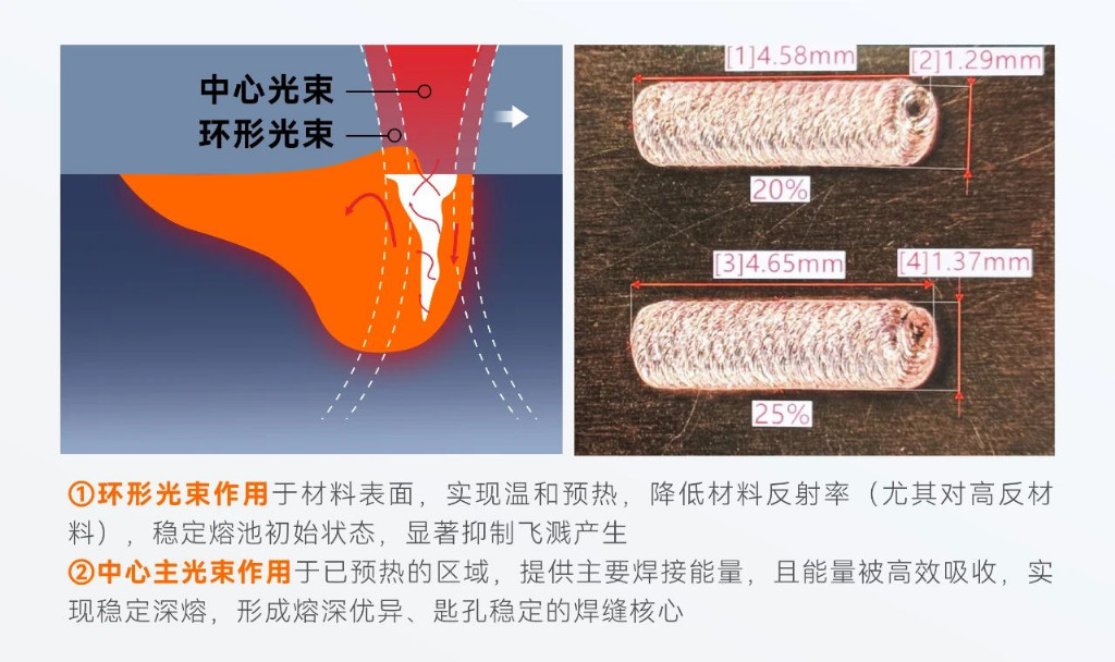 焊接過程中,中心光束能量密度高、光斑區域小,主要承擔深熔焊接任務,提供核心焊接能量;外環光束能量密度小、光斑區域大,主要發揮預熱及冷卻緩沖作用,有助于穩定熔池、減少飛濺。