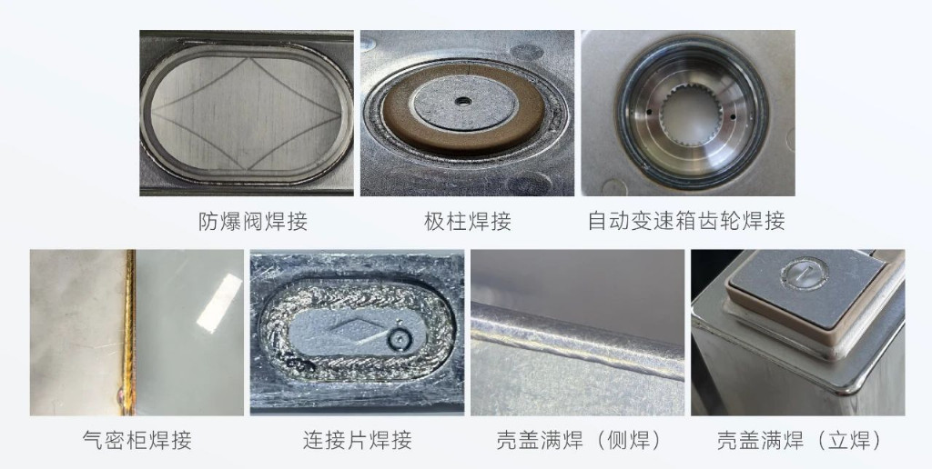 在新能源動力電池殼蓋滿焊中,針對 3003 鋁合金外殼焊接易飛濺、易產生內部氣孔等問題,采用定制化的多波長復合焊接方案后,焊接過程無明顯飛濺,焊接后整體外觀光滑,焊縫穩定可靠、無炸點、無虛焊,R 角形貌良好,滿足實際需求。目前,該方案已在新能源鋰電池、汽車制造、機械制造、鈑金箱柜、廚衛家電等領域實現批量化應用。