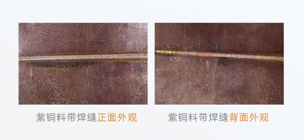 在某項目中,需要將0.15mm紫銅料帶拼焊到一起,雙面成型。寶辰鑫為客戶提供了以風冷QCW激光器150/1500為核心光源的焊接方案,并采用脈沖模式進行焊接,峰值功率高,熱輸入小,避免了連續焊接下持續熱輸入過大時材料容易焊穿、功率不夠又無法焊上的問題,實現了對薄材高反材料紫銅的穩定焊接,焊接效果滿足客戶加工要求,拉力達到853N。