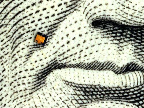 無處不在的激光。激光技術第一次走進日常生活,是美國超市使用發出紅色氦氖激光的條形碼掃描槍實現收款自動化。若爾斯·阿爾費羅夫(Zhores Alferovand )和赫伯特·克勒默(Herbert Kroemer)發明了制作半導體二極管激光器的改進方法,讓激光真正地無處不在。他們因此獲得了2000年的諾貝爾物理獎。(圖中所示為一個半導體二極管激光器和五美元鈔票大小的對比。)如今,這樣的芯片隨處可見,比如說CD播放器、藍光播放器、紅色激光筆和全球電信網絡的骨干中。