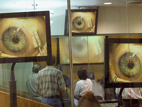 激光外科手術。激光在醫學上的首次成功應用是進行眼內手術,但是不需要切開眼球。早在1962年,一臺紅寶石激光器將病人脫落的視網膜與眼球重新連接,使他恢復了視力。更大的成功在1968年到來,外科醫生弗朗西斯·萊斯佩朗斯和貝爾實驗室的工程師使用氬離子激光器破壞異常的血管,以避免這些血管在視網膜中擴散,致使糖尿病人失明。這種治療方法已經挽救了數百萬人的視力。如今,激光也被用來切割角膜,以矯正視力,或者使胎記和刺青褪色。