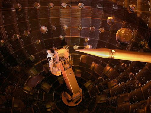 激光之母。受控核聚變很久以來都是人們認為最理想的清潔能源發電方式。1962年,勞倫斯利弗莫爾國家實驗室的物理學家約翰·納科爾斯(John Nuckolls)在加利福尼亞州利弗莫爾,提出用激光脈沖加熱和壓縮的重氫同位素塊實現受控核聚變。從那以來,利弗莫爾實驗室一直追尋著這個理念,他們使用的激光器也越來越大,終于在美國國家點火實驗設施中達到巔峰。 這是一個復雜的系統,可以同時發出192束激光,去年,在十億分之幾秒的時間內,產生了能量達到100萬焦耳的激光脈沖,使之成為有史以來能量最強的激光器。美國國家點火實驗設施 (NIF)是美國出于研究核聚變反應設想而建造的試驗裝置。)
