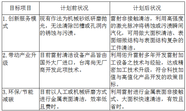 透過計劃內容的協助推動,開發高功率雷射二極管直接輸出模塊技術與后背式機架與手持掃描裝置技術,預期將產出第一部自有技術開發之高功率、手持式雷射表面清潔系統,提升雷射產業應用設備與服務項目,創造高功能性與高值化雷射應用產品,可望為雷射應用產業創造整體產值效益,增加產業國際競爭力。